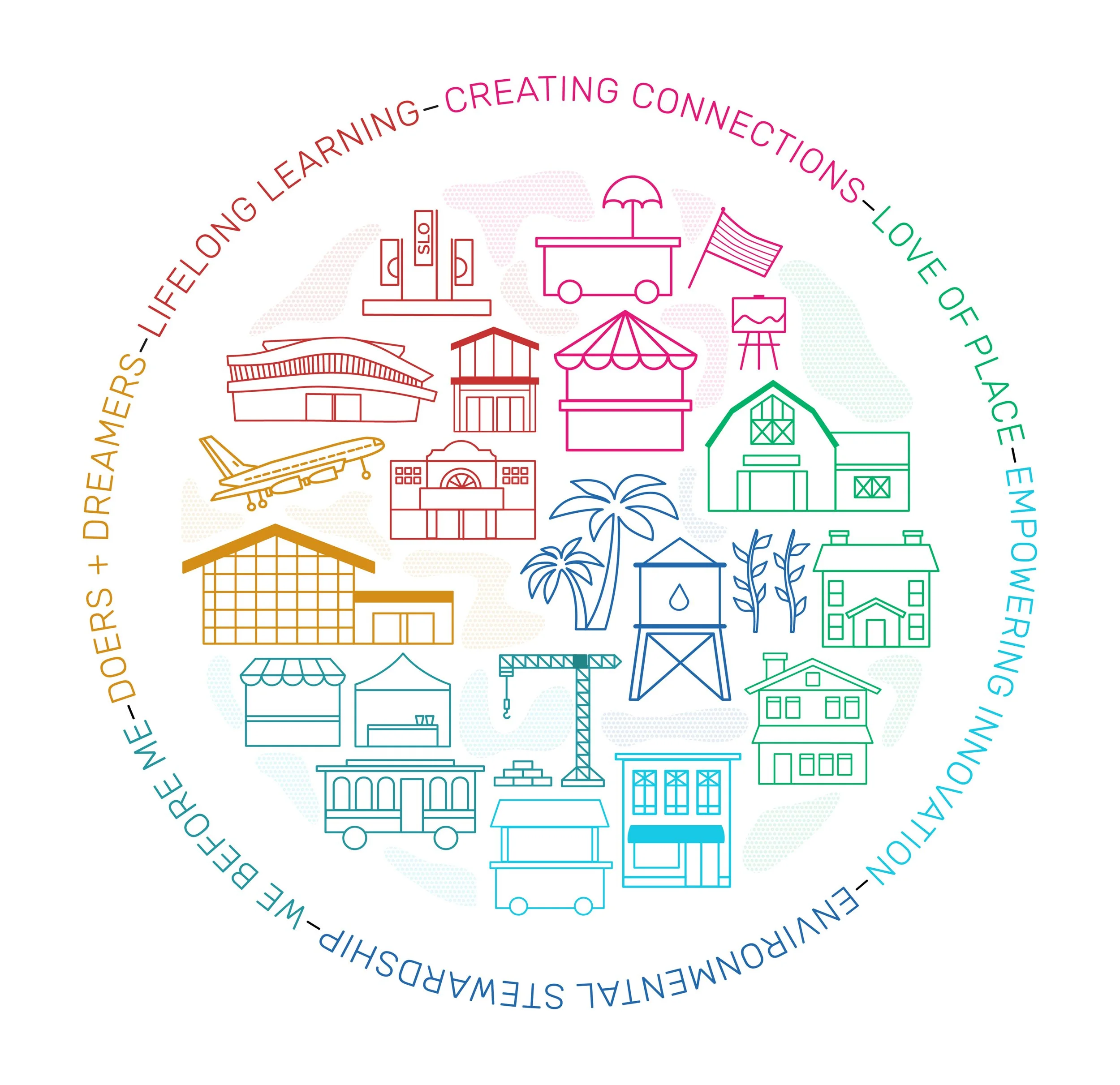 Each pillar is represented by an illustrated scene featuring San Luis Obispo-specific icons, such as Cal Poly, the Performing Arts Center, the weekly farmer’s market, and the renovated airport. Each pillar also has a unique color inspired by city photos—greens from the landscapes, reds from the buildings, and blues from the ocean.